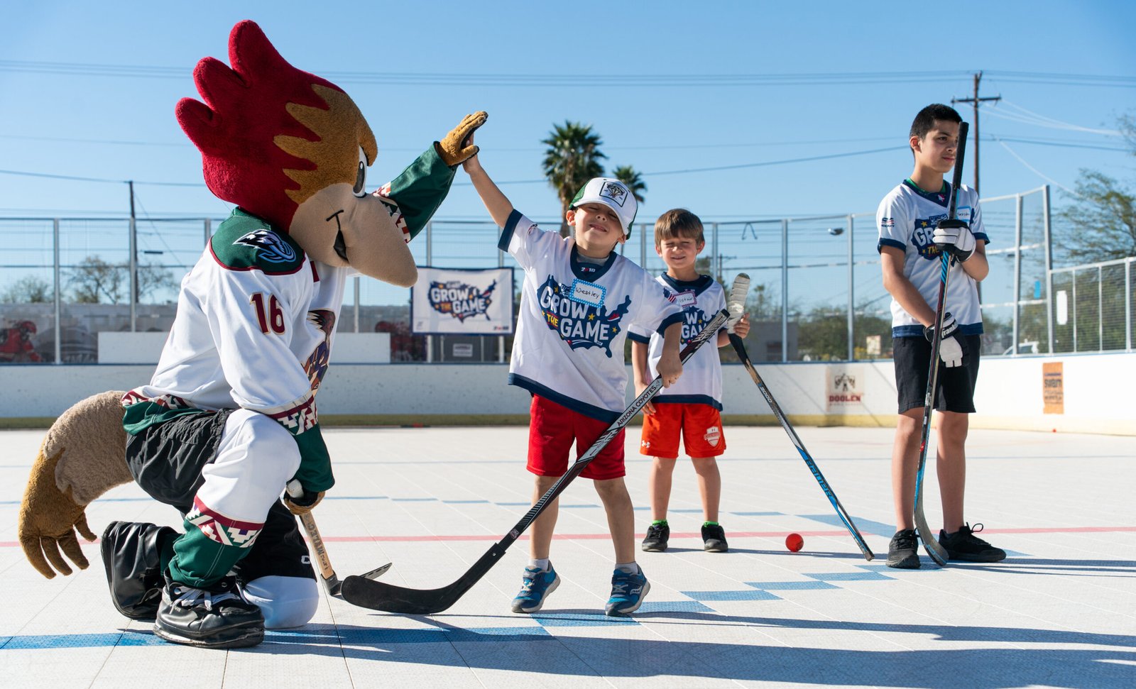 TUCSON, AZ – This past weekend, USA Ball Hockey and Knapper partnered with Tucson Ball Hockey to bring a free Grow the Game Day clinic to families in the heart of the Sonoran Desert. The players were even surprised by a visit from Dusty, the mascot of the AHL Tucson Roadrunners!